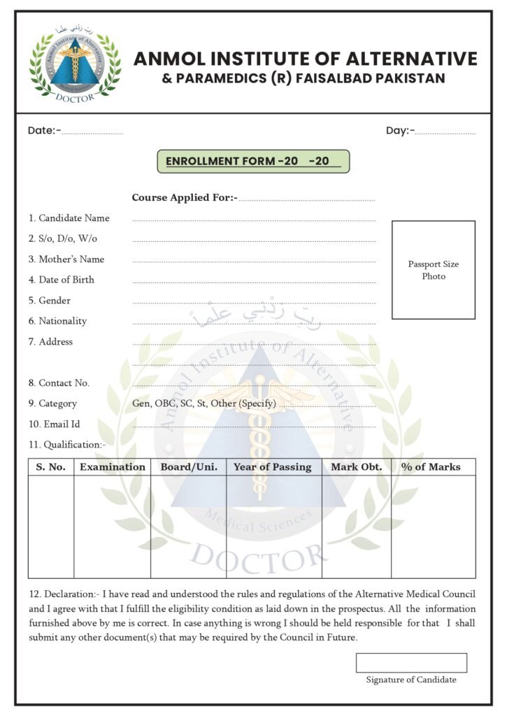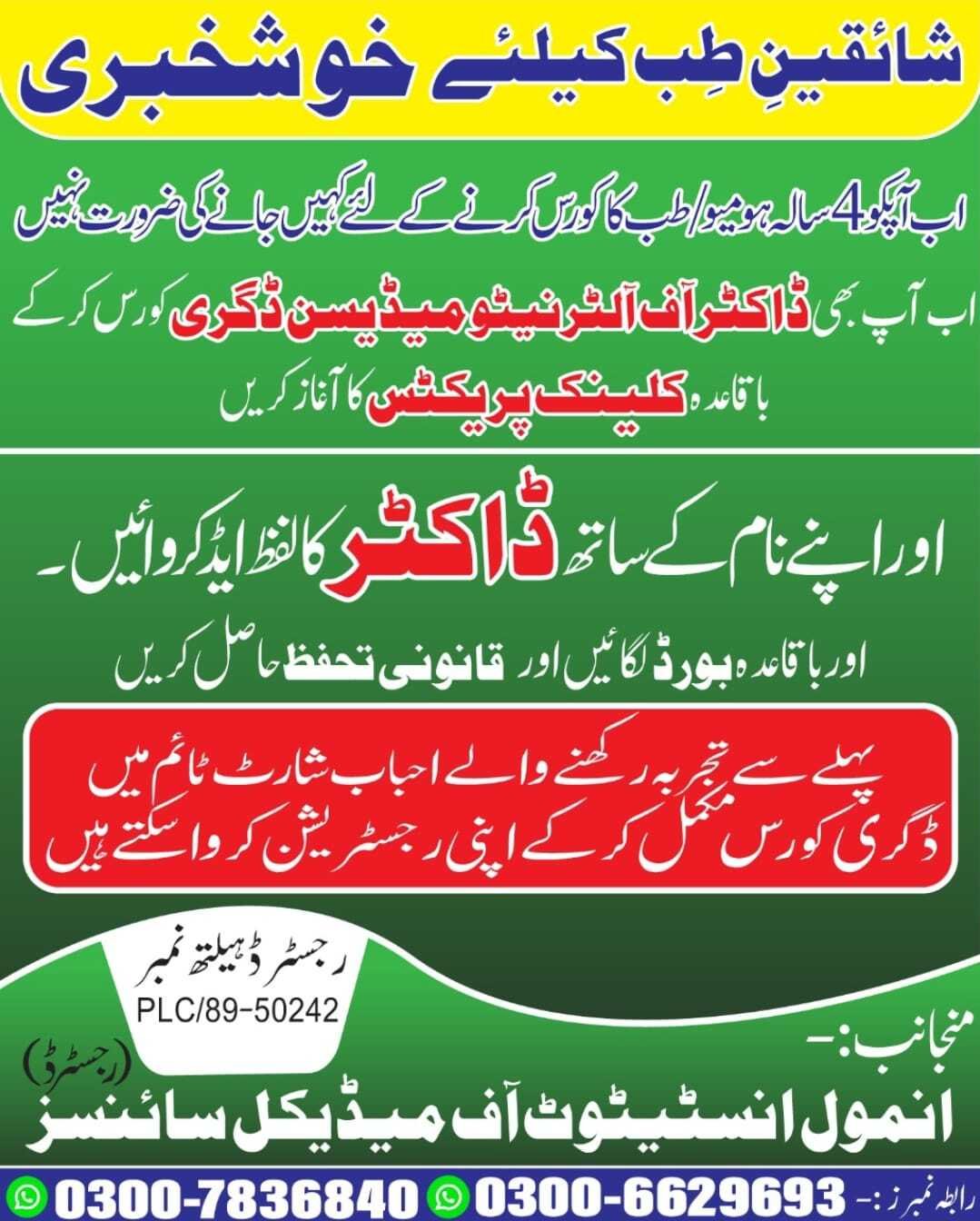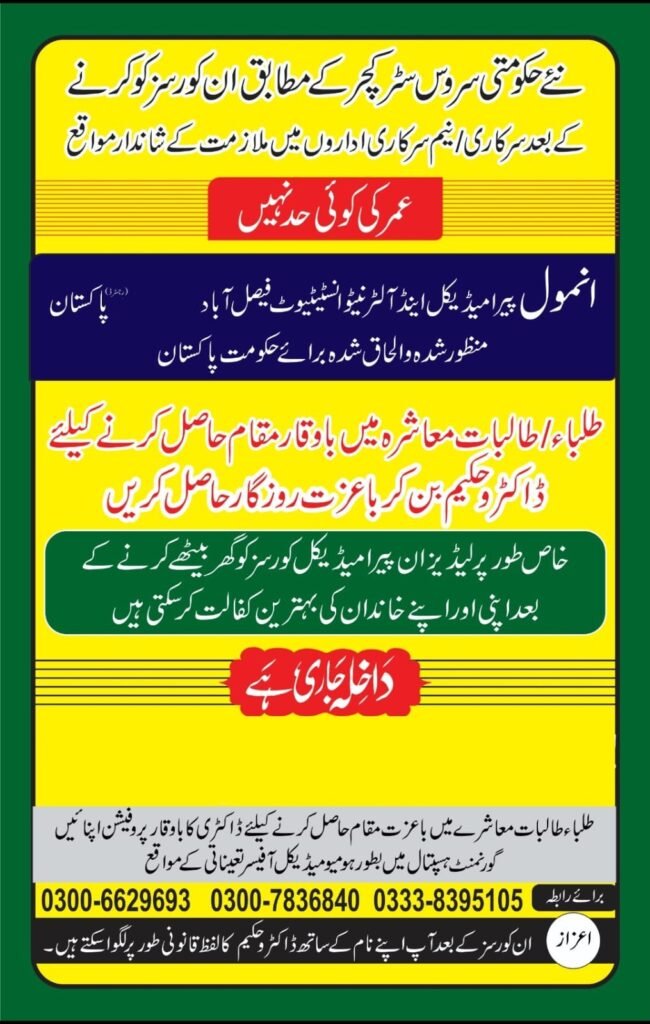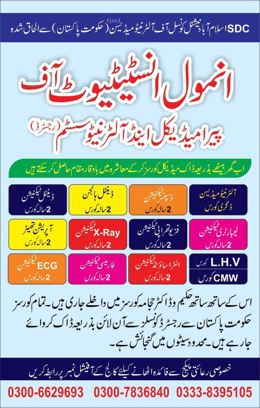 ادارہ نے اپنے طلبہ طالبات کی سہولت کے پیش نظر مختلف پیرا میڈیکل کورسز شارٹ ٹائم مئی کروانے کا بھی اہتمام کیا ہوا ہے. یہ تمام کورسز پاکستان کی رجسٹرڈ میڈیکل کونسلز سے باقاعدہ تصدیق شدہ ہیں اور آن لائن ویریفکیشن ریکارڈ کے ساتھ دیے جا رہے ہیں. آپ بھی جس کورس میں داخلے کے خواہش مند ہوں اپنے ڈاکومنٹس کے ساتھ اپلائی کر سکتے ہیں.